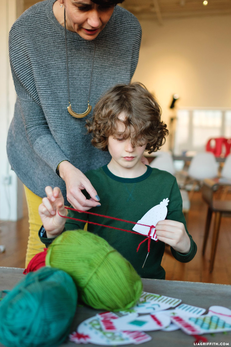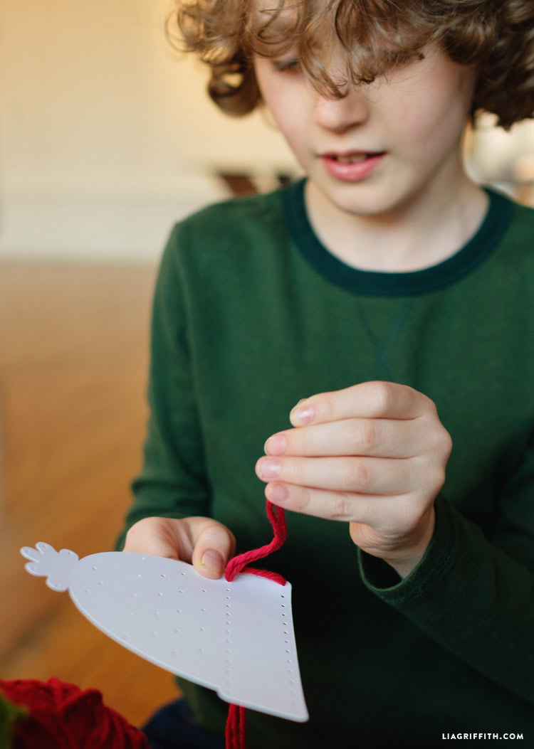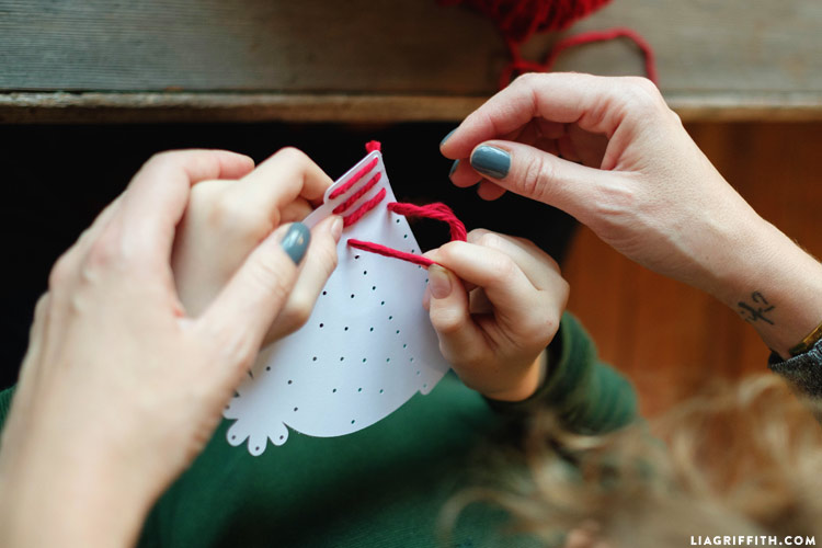 There is no real technique for our Christmas yarn art. As long as you continue threading the yarn through the dots, it will turn out just as intended! Tie single knots to the back of the card to change colors, and feel free to use as many colors as you'd like. In our PDF download, Krista included examples of how she created her Christmas yarn art for a bit of inspiration. This project is an easy way to practice introductory embroidery; after you're done, you can string it into a nice holiday garland!
