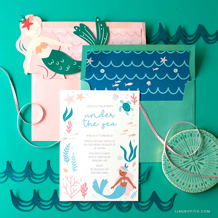 Make sure to download the font Quicksand to edit your mermaid invitations. Once your invites have all the details in place, print them on white cardstock. Print envelope liners on white text weight paper.