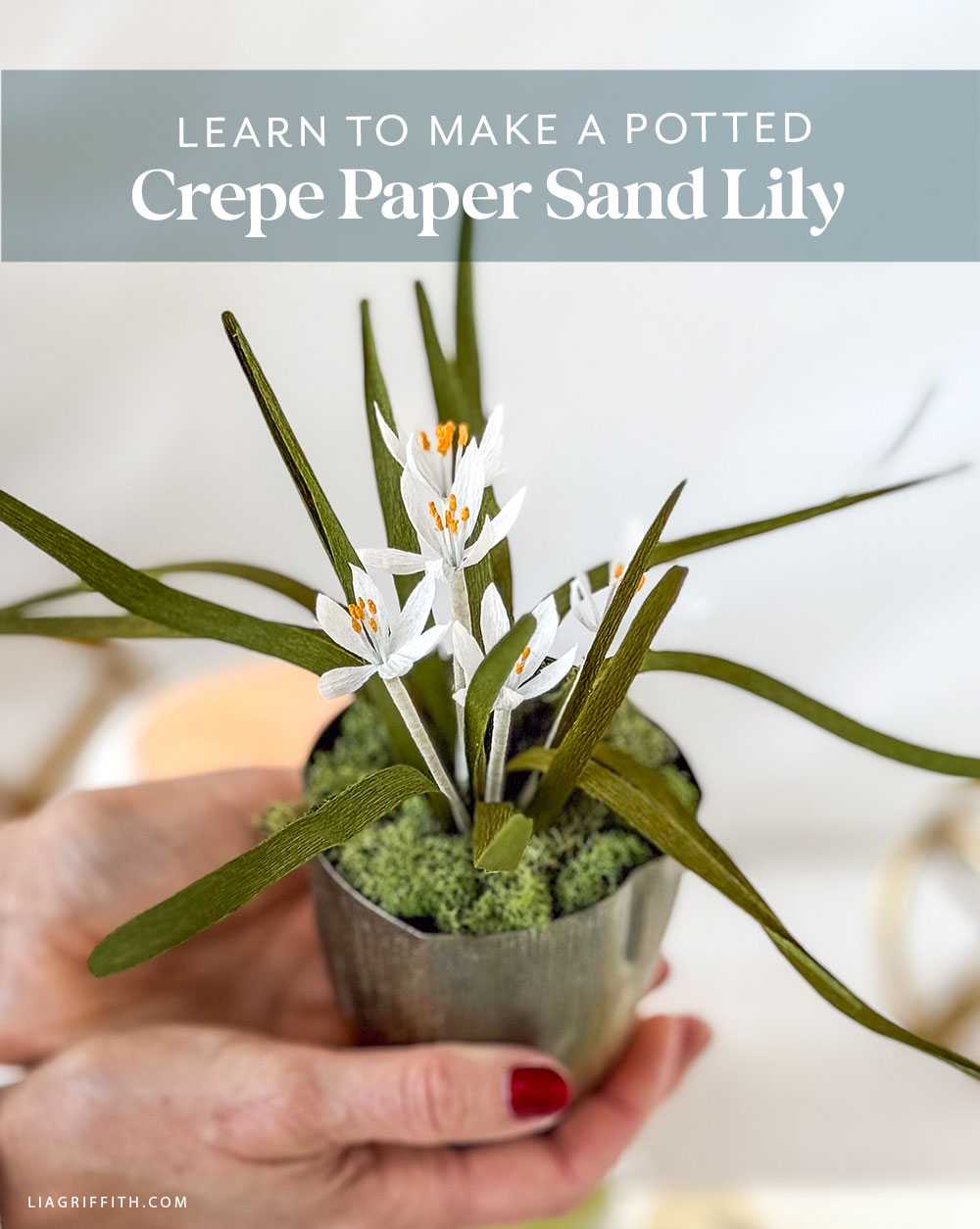 We consider this Crepe Paper Potted Sand Lily an intermediate-level project, perfect for crafters who are comfortable with shaping, stretching, and layering crepe paper. While some patience is required to achieve the most stunning results, this project more than rewards that diligence. So we encourage you to slow down and enjoy the entire creative process as you turn simple crepe paper into a truly elegant showpiece. By the time you assemble the stems and “plant” your lily in its little pot, this project will feel like a breath of calm.